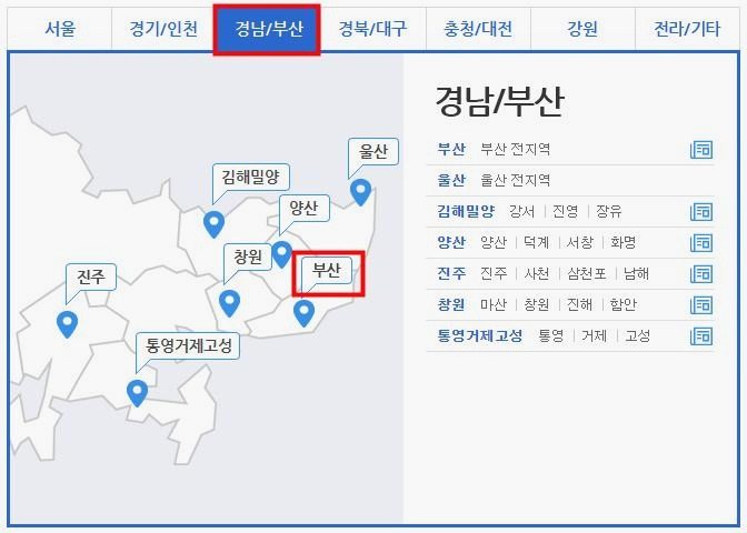 클릭을 하게 되면 지역의 벼룩시장을 선택을 할수가 있는 화면에 나오게 되어 지는데 맨 위에 있는 부분에서 경남 부산 지역을 선택을 해보고 하단쪽에 나오게 되는 세부 지역에서 부산을 골라주면 돼요.