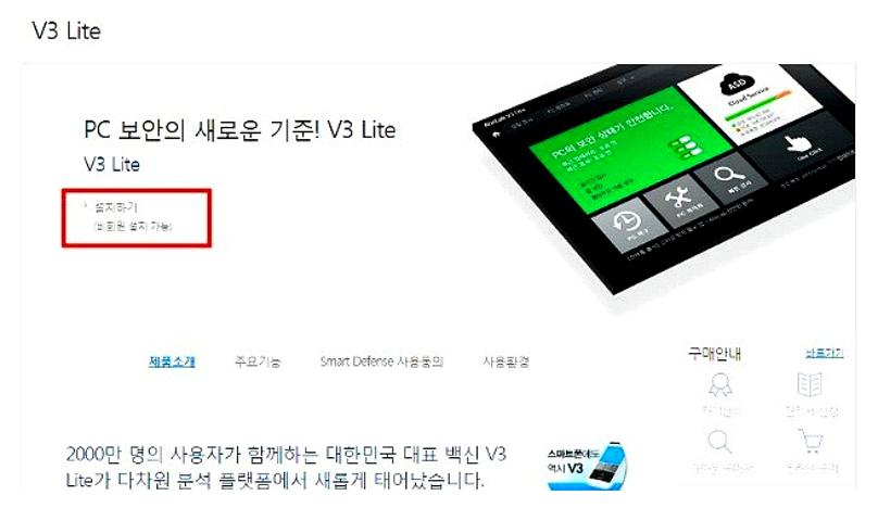 V3 lite 다운로드를 위해서는 공식 홈페이지에서 다운로드하셔야 합니다. 다운로드 방법은 간단합니다. 링크를 클릭하여 '설치하기' 버튼을 누르시면 됩니다.