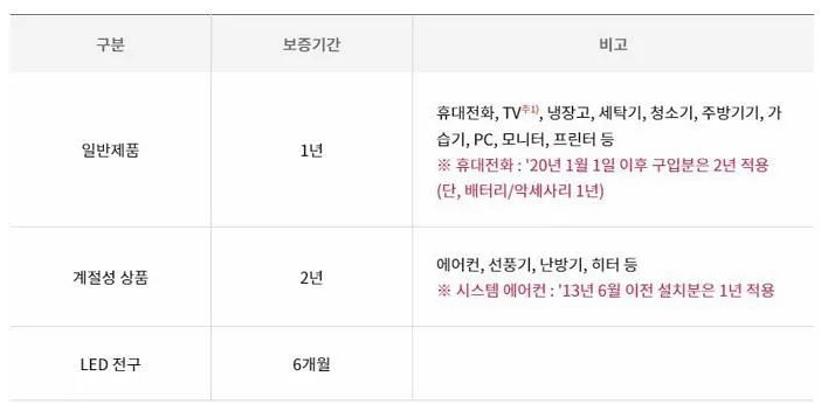 엘지에서 판매하는 제품들은 보증기간이 모두 다릅니다. 일반 제품은 1년 보증이지만 계절성 상품인 에어컨, 선풍기, 난방기, 히터 등은 2년의 보증 기간이 주어지며, 2013년 6월 이전 제품도 1년 보증 기간이 적용됩니다.
